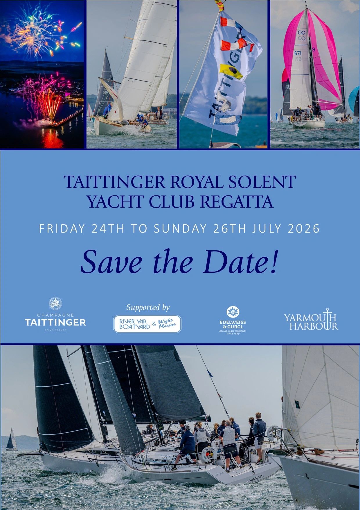 Advantages of The Taittinger Regatta: PRESTIGE & RECOGNITION, One of the most respected regattas in the sailing callendar. Draws professional sailors, corporate teams, and passionate amateurs - perfect for networking and visibility. Challenging competition. Diverse fleet and competitive classes test both skill and strategy. Offers a real racing experience without requiring a full professional crew. Scenic location: YARMOUTH. Picturesque Harbour - protected waters and stunning coastal view. PROFESSIONAL ORGANISATION, experienced Race Committees, great Taittinger parties for corporate teams, client entertainment, or just bonding with family and friends. Coverage in sailing media and social channels can enhance your brand or personal recognition.